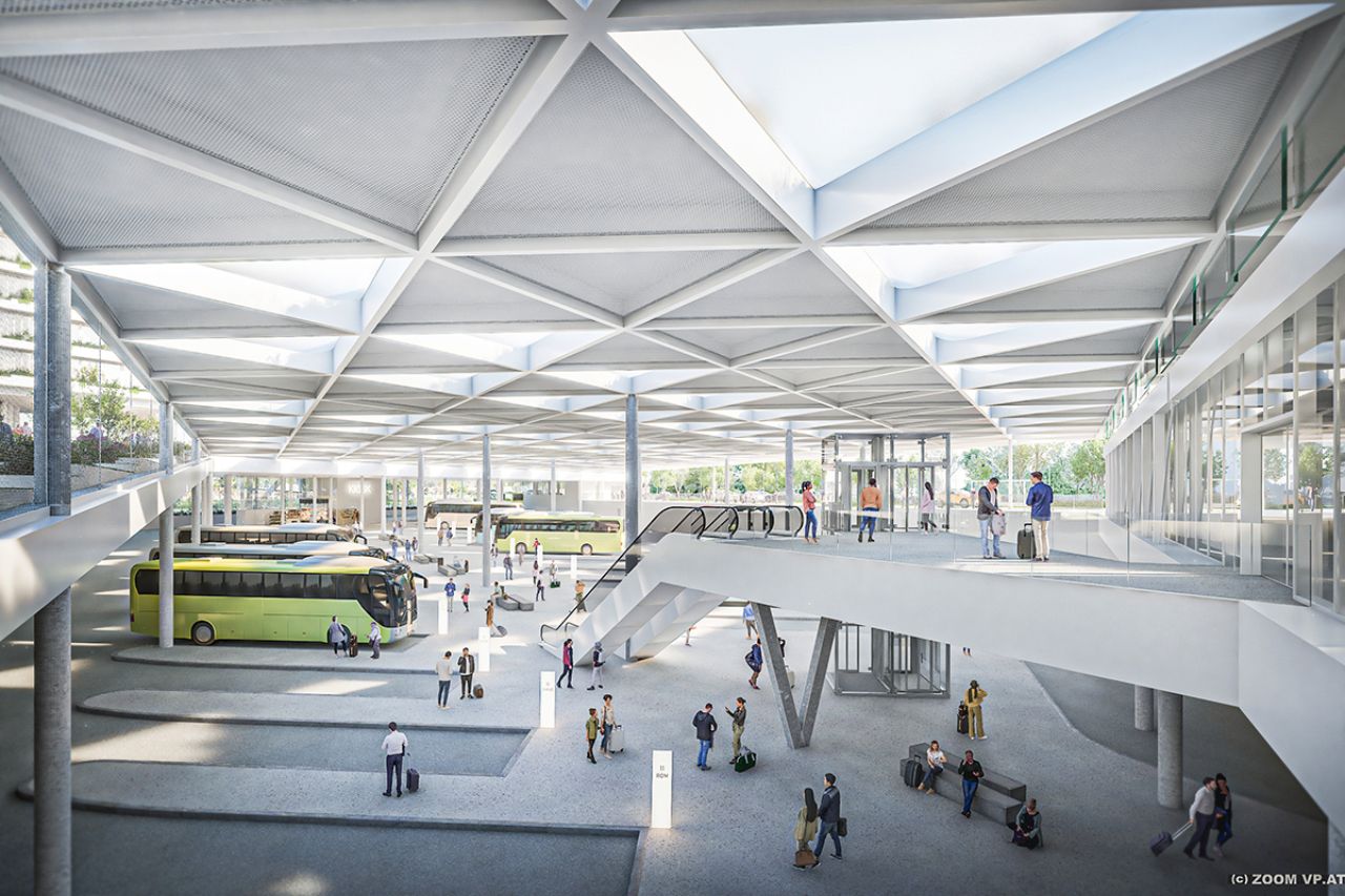 Moderní a udržitelný dopravní uzel pro dálkové autobusy s 30 zastřešenými nástupišti a přilehlým hotelem nahradí dosavadní vídeňská autobusová stanoviště.